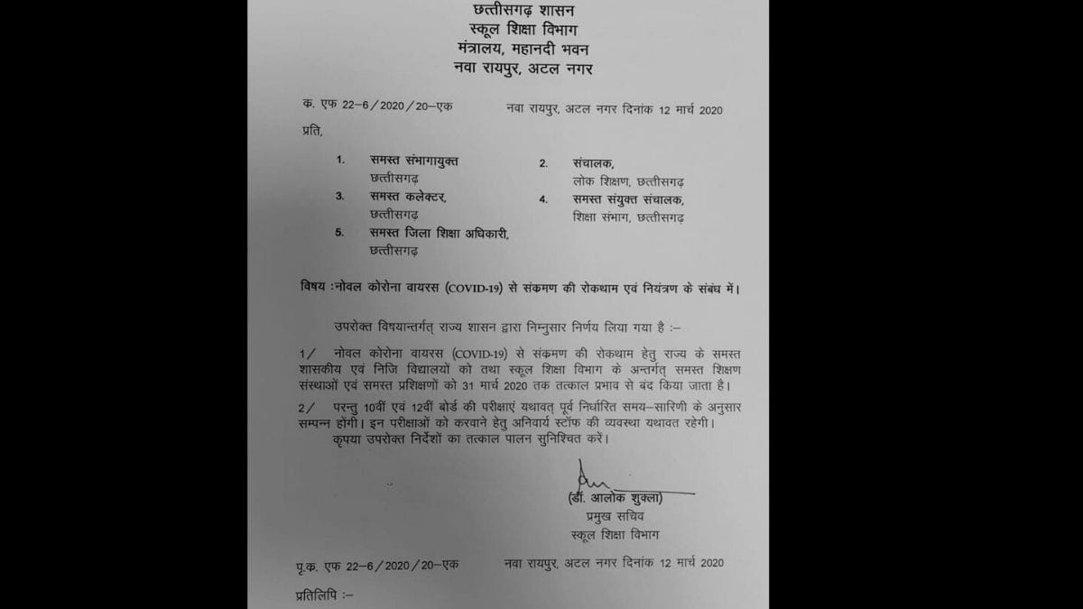 मुख्यमंत्री के नेतृत्व में सम्पन्न इस उच्चस्तरीय बैठक के बाद सरकार द्वारा देर रात जारी एक विज्ञप्ति में कहा गया कि ‘राज्य शासन द्वारा नोवल कोरोना वायरस ¼ कोविड -19½ से संक्रमण की रोकथाम के लिए प्रदेश के समस्त शासकीय तथा नीजि विद्यालयों को और स्कूल शिक्षा विभाग के अंतर्गत समस्त शिक्षण संस्थाओं तथा समस्त प्रशिक्षण संस्थानों को 31 मार्च 2020 तक तत्काल प्रभाव से बंद रखने का निर्देश दिया गया है. इस आशय का आदेश आज मंत्रालय महानदी भवन स्थित स्कूल शिक्षा विभाग द्वारा प्रदेश के समस्त संभागायुक्त, संचालक लोक शिक्षण, कलेक्टर, संयुक्त संचालक शिक्षा विभाग और जिला शिक्षा अधिकारियों को जारी कर दिया गया है. इसमें 10वीं तथा 12वीं बोर्ड की परीक्षाएं यथावत पूर्व निर्धारित समय-सारिणी के अनुसार सम्पन्न होगी. इन परीक्षाओं के संचालन के लिए आवश्यक स्टाफ की व्यवस्था यथावत रहेगी.’