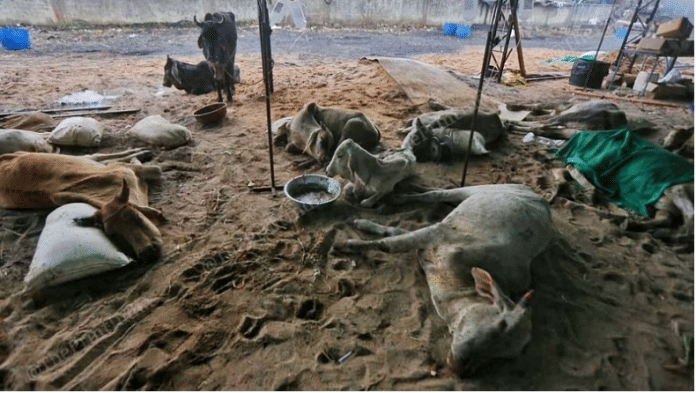 जो गाय तकलीफ में अपने दांत किटकिटा रही थी, वो यहां मुसीबत में अकेली नहीं थी. दिप्रिंट ने जब इलाके का दौरा किया तो कच्छ जिले के इस अस्थायी शिविर में ऐसी कम से कम 50 गाएं और भैसें थीं जो लंपी स्कीन की बीमारी से संक्रमित हैं, जिसने गुजरात और राजस्थान के कई इलाकों की मवेशी आबादी को अपनी चपेट में ले लिया है.