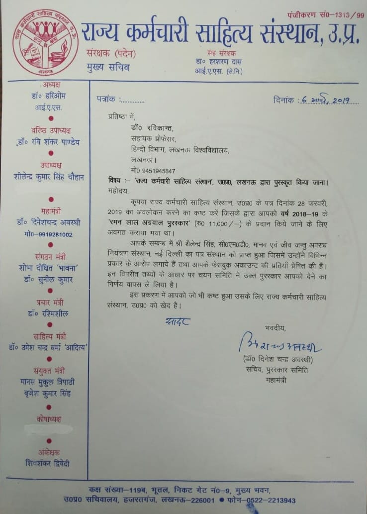 रविकांत के मुताबिक, उन्हें 28 फरवरी को संस्था की ओर से पत्र मिला जिसमें उन्हें साहित्य में योगदान के लिए अवाॅर्ड दिए जाने की बात कही गई. इसमें 11 हजार नगद राशि भी दी जाती है. ये अवाॅर्ड उन्हें आगामी 17 मार्च को मिलने वाला था जो कि अब कैंसिल हो गया है. पत्र में कहा गया है कि दिल्ली में एक एनजीओ के सीएमडी द्वारा रविकांत के कई फेसबुक पोस्ट पर आपत्ति जताई गई है. इसी कारण संस्थान द्वारा उनका अवाॅर्ड कैंसिल किया जाता है.