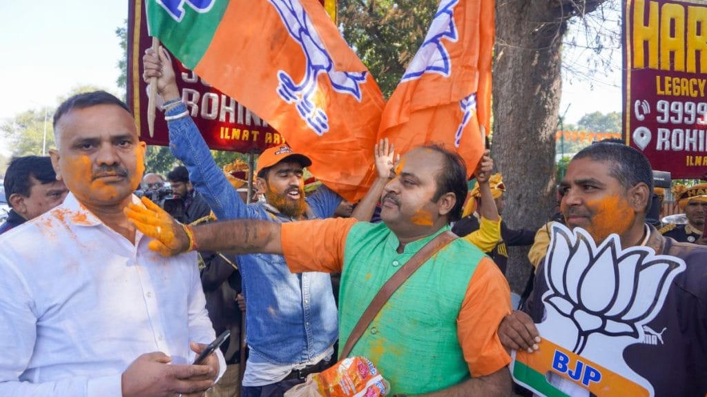 भाजपा के चुनाव चिह्न कमल के ‘कटआउट’ पकड़े हुए समर्थकों ने एक-दूसरे को भगवा रंग भी लगाया.