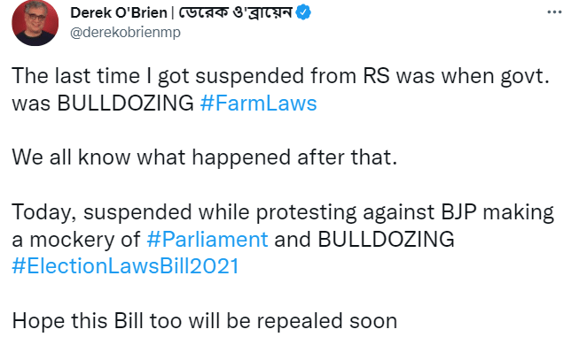 अपने निलंबन के बाद टीएमसी नेता डेरेक ओब्रायन ट्वीट कर कहा कि, ‘आज मुझे तब सस्पेंड किया गया जब वह बीजेपी द्वारा संसद का मजाक बनाये जाने और निर्वाचन कानून बिल 2021 को जमींदोज किए जाने का विरोध कर रहे थे.’