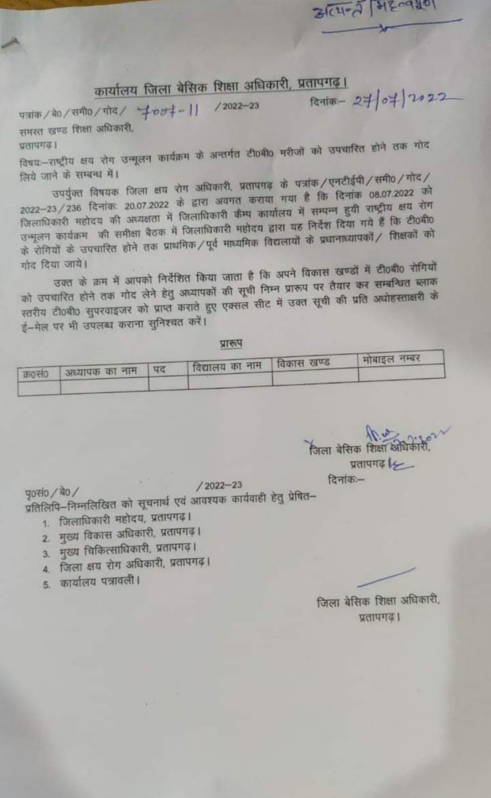जिला बेसिक शिक्षा अधिकारी के द्वारा खण्ड शिक्षा अधिकारियों को जारी किए गए एक पत्र में जिलाधिकारी के निर्देशों का हवाला देते हुए कहा गया है कि जिलाधिकारी महोदय की अध्यक्षता में जिलाधिकारी कैंप कार्यालय में संपन्न हुए राष्ट्रीय क्षय रोग उन्मूलन कार्यक्रम में यह निर्देश दिया गया है कि टीबी के रोगियों का इलाज होने तक प्राथमिक/पूर्व माध्यमिक विद्यालयों के प्रधानाध्यापकों/शिक्षकों को गोद दिया जाए. इस संदर्भ में जिला बेसिक शिक्षा अधिकारी द्वारा खण्ड शिक्षा अधिकारियों को निर्देशित किया गया है कि वे ऐसे शिक्षकों की सूची बनाकर उपलब्ध कराएं.