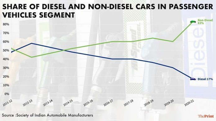 2019-20 और 2020-21 के बीच, बाज़ार में डीज़ल गाड़ियों की हिस्सेदारी 29.5 प्रतिशत से घटकर 17 प्रतिशत पर आ गई, जबकि पेट्रोल गाड़ियों की हिस्सेदारी 66 प्रतिशत से बढ़कर 76 प्रतिशत हो गई. सीएनजी कारें, जो मुख्य रूप से बड़े मेट्रो शहरों में चलती हैं, 4 प्रतिशत से उछलकर 6 प्रतिशत पर आ गईं. इलेक्ट्रिक और हाईब्रिड वाहनों की हिस्सेदारी में भी मामूली वृद्धि देखी गई.
