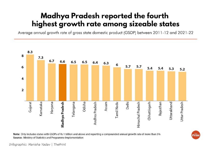 इस अवधि के दौरान, मध्य प्रदेश के सकल राज्य घरेलू उत्पाद (राज्य में उत्पादित वस्तुओं और सेवाओं का कुल मूल्य) में प्रति वर्ष औसतन 6.65 प्रतिशत की वृद्धि हुई – जो गुजरात (8.35 प्रतिशत), कर्नाटक (7.33 प्रतिशत) और हरियाणा (6.7 प्रतिशत) के बाद चौथी सबसे बड़ी वृद्धि दर है.
