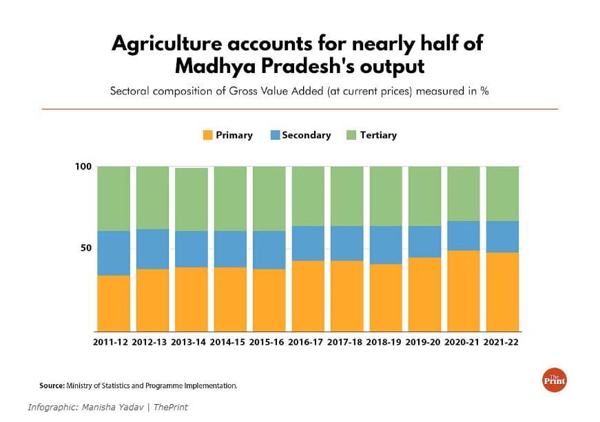 अब सवाल यह उठता है कि जीएसडीपी के मामले में चौथी सबसे ऊंची विकास दर होने के बावजूद मध्य प्रदेश अभी भी उसकी तुलना में इतनी समृद्ध क्यों नहीं हुआ है? इसका जवाब उस विकास पथ में बसा है जिसे राज्य ने कृषि पर ध्यान केंद्रित करते हुए चुना है. आंकड़ों से पता चलता है कि मध्य प्रदेश अब अपनी आय के लिए एक दशक पहले की तुलना में कृषि पर अधिक निर्भर है. अपने पड़ोसियों की तुलना में, 2011 के बाद से इसमें अभूतपूर्व कृषि विकास देखा गया है.