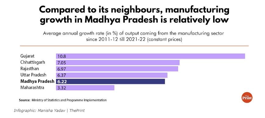 विनिर्माण उत्पादन की वृद्धि के मामले में, मध्य प्रदेश का प्रदर्शन अपने पड़ोसी राज्यों में से सिर्फ महाराष्ट्र से बेहतर है, जिसने इस 10 साल की अवधि में 3.32 प्रतिशत प्रति वर्ष की वृद्धि देखी, जबकि मध्य प्रदेश की 6.22 प्रतिशत की वृद्धि हुई है. दूसरी ओर, गुजरात में विनिर्माण इस दशक में हर साल 10 प्रतिशत की दर से बढ़ा, इसके बाद छत्तीसगढ़ (7 प्रतिशत), राजस्थान (6.97 प्रतिशत) और उत्तर प्रदेश (6.37 प्रतिशत) ने लिस्ट में अपनी जगह बनाई है.