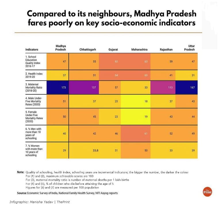 इसके अलावा, इसने नीति आयोग के 2019-20 स्वास्थ्य सूचकांक में 37 अंक प्राप्त किए, जो केवल बिहार और उत्तर प्रदेश से ऊपर है. इसने नीति आयोग के 2016-17 स्कूल शैक्षिक गुणवत्ता सूचकांक में भी 47 के स्कोर के साथ खराब प्रदर्शन किया – जो इसके सभी पड़ोसी राज्यों से भी बदतर है.