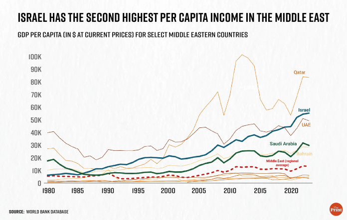 अंतर्राष्ट्रीय मुद्रा कोष के विश्व आर्थिक आउटलुक डेटाबेस के अनुसार, इज़राइल की प्रति व्यक्ति आय नौ गुना से अधिक बढ़कर 58,273 डॉलर तक पहुंच गई है, जो कतर ($83,890) के बाद मध्य पूर्व में दूसरी सबसे अधिक है. वास्तव में, 2023 की कीमतों में, इज़राइल की प्रति व्यक्ति आय यूनाइटेड किंगडम ($46,370), जर्मनी ($53,800), फ्रांस ($45,190) और सऊदी अरब ($29,920) जैसे कई ‘विकसित’ देशों की तुलना में अधिक है.