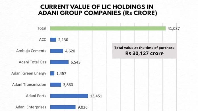 स्टॉक एक्सचेंजों के डेटा से पता चलता है कि एलआईसी के पास छह अडाणी कंपनियों में फैले 50.98 करोड़ शेयर हैं. सोमवार को इन शेयरों का क्लोजिंग प्राइस लेते हुए दिप्रिंट ने गणना की कि इन कंपनियों में एलआईसी के शेयरों का बाजार मूल्य वर्तमान में 41,087 करोड़ रुपये है.