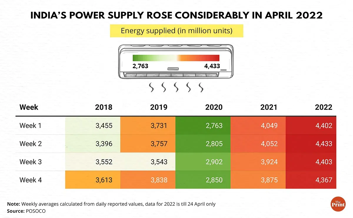 पीओएसओसीओ की दैनिक रिपोर्ट्स के अनुसार, इस साल अप्रैल में 1 से 25 तारीख़ के बीच भारत में हर रोज़ ऊर्जा की क़रीब 4,400 मिलियन यूनिट्स सप्लाई की गईं. इसकी तुलना में, 2018 से 2021 के बीच (सिवाय 2020 के) अप्रैल महीने में भारत में रोज़ाना औसतन 3,500 मिलियन यूनिट्स सप्लाई की गईं, जिसका अर्थ है कि इस साल अप्रैल महीने में बिजली की खपत 25 प्रतिशत अधिक रही है.