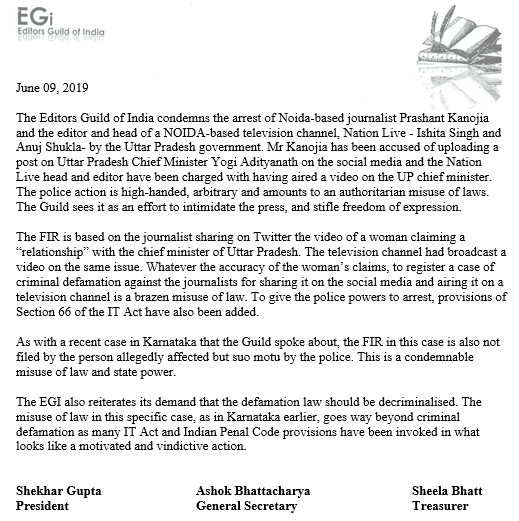 गिल्ड ने ध्यान दिलाया कि कर्नाटक मामले की तरह, ‘इस (कनौजिया ) मामले में भी एफआईआर भी कथित रूप से प्रभावित व्यक्ति द्वारा दायर नहीं की गई है, बल्कि पुलिस द्वारा मुकदमा दायर किया गया.’
