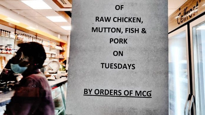 18 मार्च को गुड़गांव नगर निगम (एमसीजी) ने शहर में मंगलवार के दिन कच्चे मांस की बिक्री पर पाबंदी लगा दी, जिसका कारण कथित रूप से ‘हिंदू भावनाओं’ का सम्मान बताया गया. एमसीजी आयुक्त विनय प्रताप सिंह के कथित ऐतराज़ के बावजूद, प्रस्ताव पारित कर दिया गया. सिंह ने कथित रूप से कहा था कि भोजन एक ‘निजी पसंद’ का मामला है.