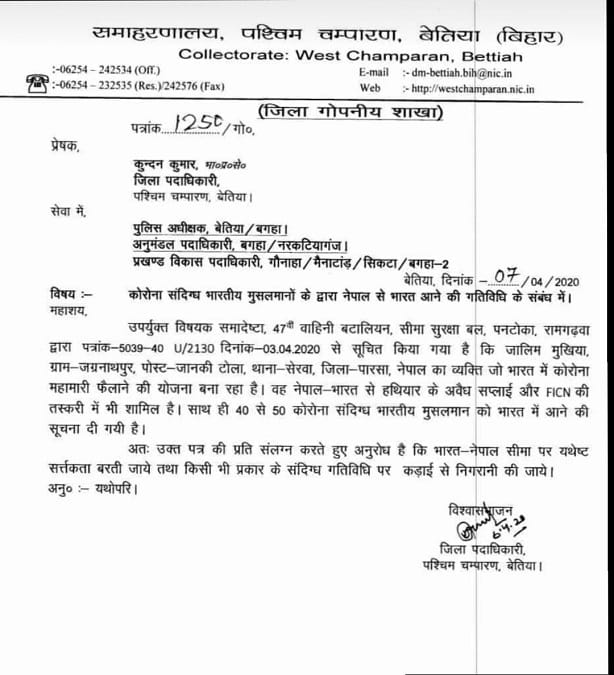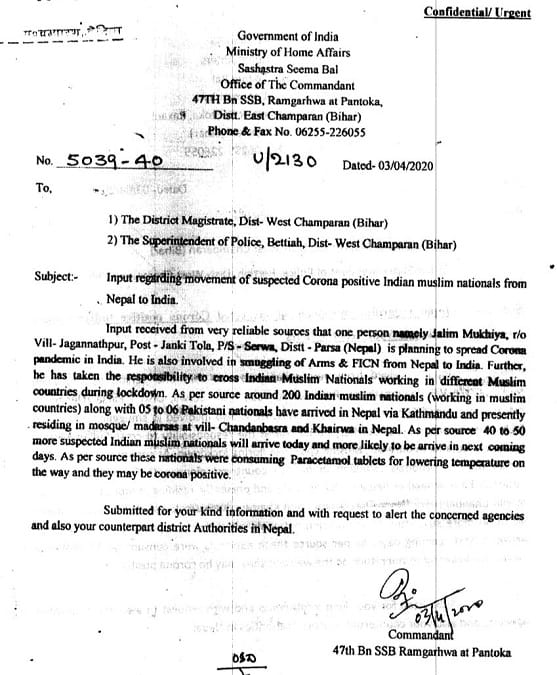 भारत सरकार के सहस्त्र सीमा बल द्वारा जारी खत की दाहिनी तरफ साफ-साफ कॉन्फीडेंशियल और अरजेंट लिखा है. इसमें सरकार ने पश्चिमी चंपारण के अधिकारियों और पुलिस वालों को एलर्ट रहने को कहा है और लिखा है, पुष्ट सूत्रों से मिली खबर के मुताबिक जामिल मुखिया जो नेपाल के जिला परसा, गांव-जगन्नाथपुर का रहने वाला है वह भारत में महामारी फैलाने की योजना बना रहा है. वह हथियार और एफआईसीएन की स्मलिंग भी नेपाल से भारत में करता है. वह इस लॉकडाउन के दौरान भारतीय मुसलमानों को हथियार बना कर देश में महामारी फैलाने की जुगत में लगा है.