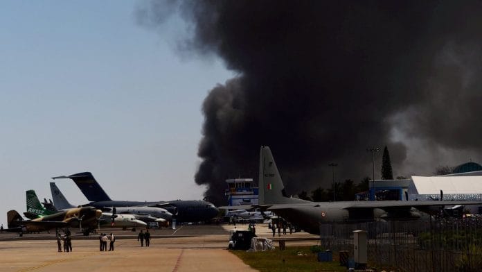 आग लगने का सटीक कारण अभी तक अधिकारी नहीं जान सके हैं. आग बुझाने के लिए अग्निशमन दल की 10 गाड़ियां घटनास्थल पर गईं थीं. अपरान्ह 2 बजे से शाम 5 बजे तक का प्रस्तावित हवाई शो तय समय पर शुरू हो गया.
