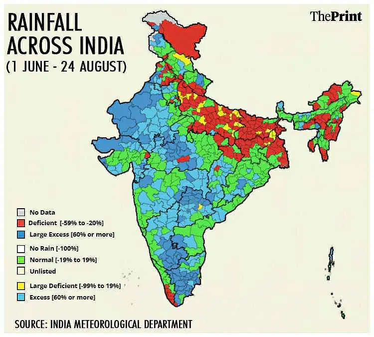 भारत मौसम विज्ञान विभाग (आईएमडी) के आंकड़ों से पता चलता है कि 1 जून और 10 अगस्त के बीच पूर्वी और उत्तर पूर्वी भारत में, बारिशों में 18% की कमी रही, जबकि मध्य और दक्षिणी क्षेत्रों में क्रमश: 24% और 28% की अधिकता देखी गई.