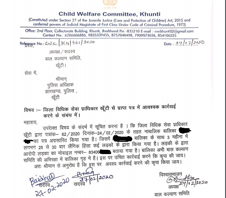 पीड़िता पांचवी कक्षा तक पढ़ी है. खूंटी के चाइल्ड वेलफेयर कमेटी (सीडबल्यूसी) दिए बयान के मुताबिक, ‘घटना की तारीख उसे याद नहीं है. धान कटाई का समय था. उस दौरान वह खूंटी बाजार गई थी. वहीं पर बजरंग नाम के लड़के से बातचीत हुई और फिर दोस्ती. उसके साथ सूरज नाम का लड़का भी था. दोनों बगडू गांव का रहनेवाला है. बातचीत के बाद दोनों उसे बाइक पर बिठा कर सिंबुकेल गांव लेकर गया. वहां दोनों ने हड़िया पी (ताड़ी) और उसका मोबाइल ले लिया. फिर उसे बाजार लाकर छोड़ दिया.’