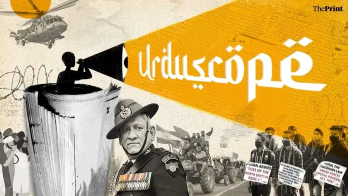 नई दिल्ली: दो त्रासद घटनाएं- एक नागालैंड में और दूसरी तमिलनाडु के कुन्नूर में- जिन दोनों में सेना शामिल थी, इस सप्ताह उर्दू प्रेस में सुर्खियों में रहीं, लेकिन किसानों का आंदोलन और उसका समापन भी फोकस में रहा. पत्रकार विनोद दुआ को समकालिक परंपराओं को आगे बढ़ाने वाले के तौर पर श्रद्धांजलि दी गई, और मथुरा में सांप्रदायिक भड़काने की साजिशों और गुरुग्राम में चल रहे संघर्ष ने भी सुर्खियां बटोरीं.