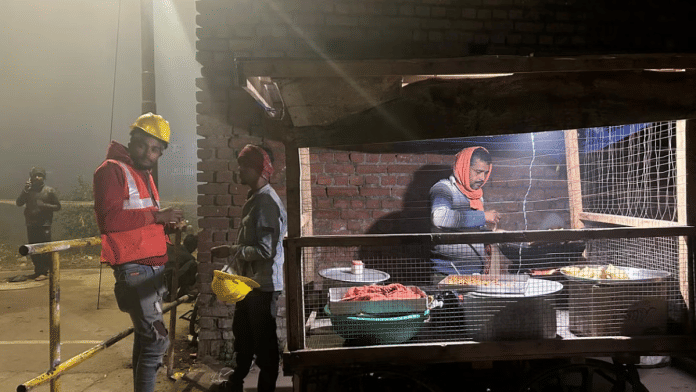 अयोध्या: 23 वर्षीय त्रिभुवन शर्मा ने रात के 10 बजे सड़क किनारे खाने की दुकान से दिन का पहला भोजन किया, वो भी हरी चटनी के साथ समोसे का. पीले रंग का सुरक्षा हेलमेट पहने हुए, शर्मा अपने सहयोगी मोहम्मद अज़मद का राम मंदिर निर्माण स्थल के लिए निकलने का इंतजार कर रहे थे.