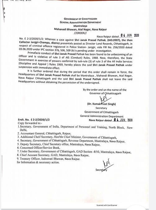 पीड़िता द्वारा पाठक के खिलाफ 3 जून को अपराध दर्ज करवाने के बाद मुख्यमंत्री भूपेश बघेल ने स्वयं इसका संज्ञान लेते हुए मुख्य सचिव आरपी मंडल को आरोपी अधिकारी को निलंबित कर जांच कराने का आदेश दिया. मुख्यमंत्री के आदेश के बाद पाठक को गुरुवार शाम को मुख्य सचिव ने निलंबित कर दिया.