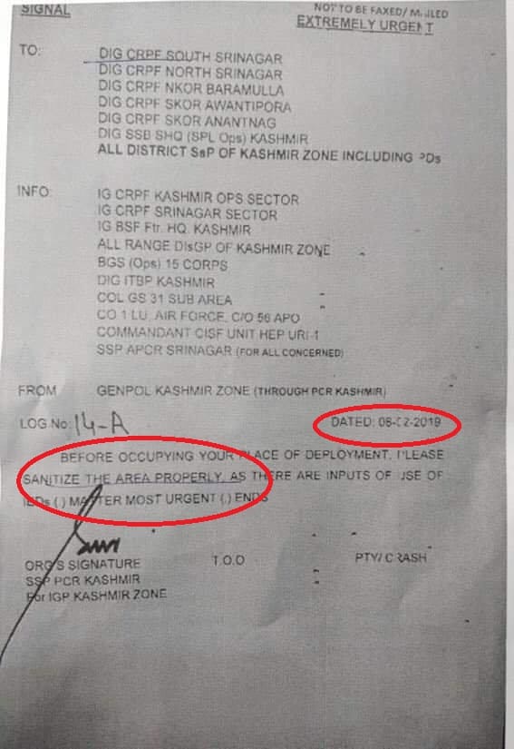 वहीं इसबीच इंटेलीजेंस का एक पत्र सामने आया है जिसमें किसी आतंकी बड़े आतंकी हमले की आशंका को लेकर सतर्क किया गया था. यह पत्र आठ फरवरी का है और इसमें ‘अति महत्वपूर्ण’ लिखकर कश्मीर पुलिस, सीआरपीएफ उत्तर-दक्षिण श्रीनगर, अनंतनाग, कश्मीर स्पेशल ऑपरेशंस सहित सभी सुरक्षा एजेंसी को सर्तक रहने की जानकारी दी गई थी.