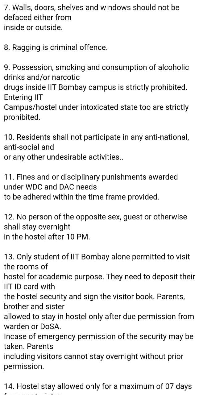 इस मामले में दिप्रिंट ने जब आईआईटी बॉम्बे के छात्रों से बात की तो पता चला कि छात्रों को मंगलवार को नया ‘हॉस्टल कंटक्ट रूल’ मेल से भेजा गया है, जिसमें ये बातें शामिल हैं. जिन छात्रों से बात हुई उन्हें मुख्य तौर पर प्वाइंट नंबर 1, 2 और 3 से आपत्ति है.