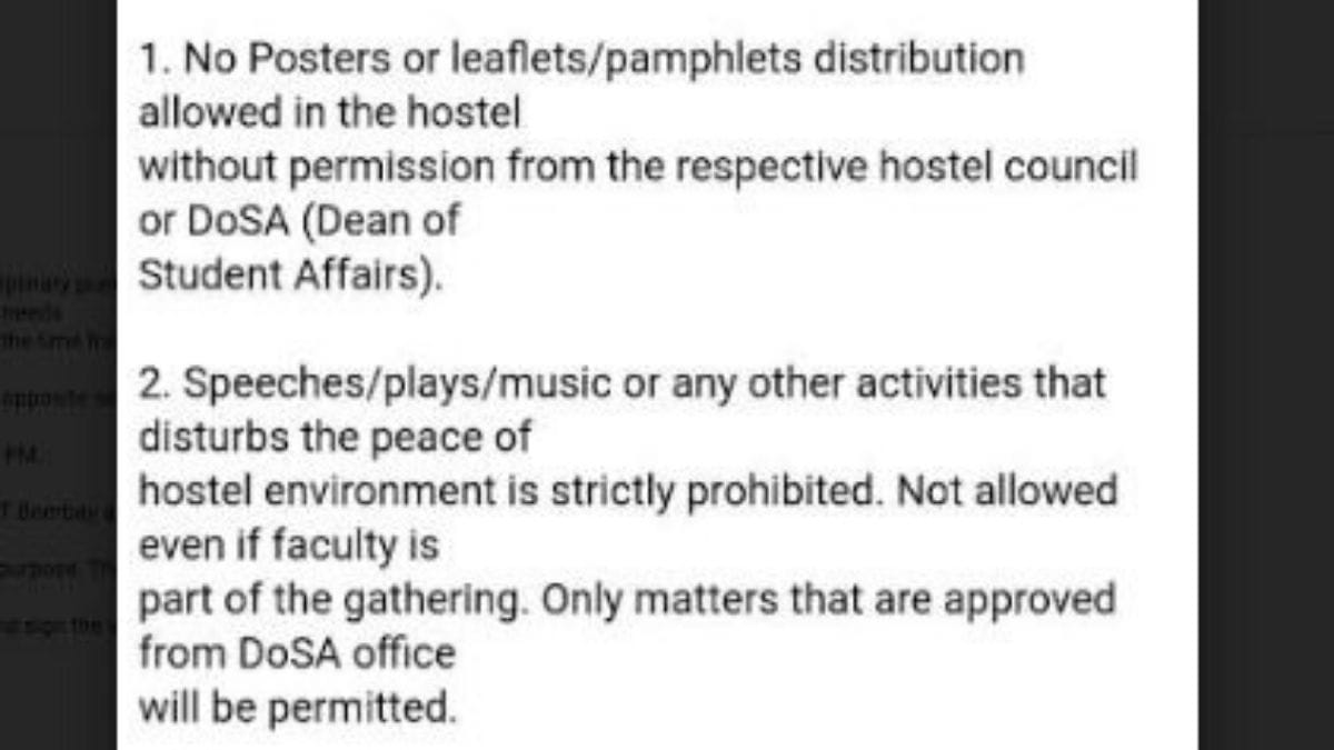 प्वाइंट नंबर 2 में किसी भी तरह के भाषण, नाटक, म्यूज़िक और इससे मिलती जुलती गतिविधि पर रोक है जिससे हॉस्टल की शांति भंग हो. प्वाइंट नंबर 2 में आगे लिखा है: ऐसी गतिविधियों की अनुमति तब भी नहीं है जबकि शिक्षक भी इसका हिस्सा हों. इसमें आगे लिखा है: सिर्फ़ वही किया जा सकता है जिसकी अनुमति डीन ऑफ स्टूडेंट्स अफ़ेयर से ली गई हो.