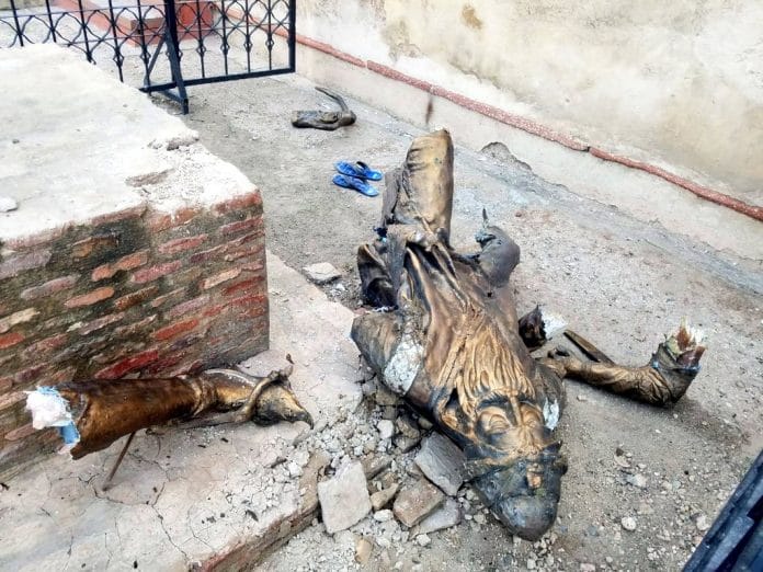 इसका एक वीडियो सोशल मीडिया पर सामने आया है जिसमें आरोपी नारे लगाते हुए मूर्ति की बांह तोड़ते और सिंह की प्रतिमा को घोड़े से नीचे गिराते दिख रहा है. वीडियो में यह भी दिखा कि इसी दौरान एक अन्य व्यक्ति प्रतिमा को नुकसान पहुंचाने वाले व्यक्ति को आकर रोकता है.