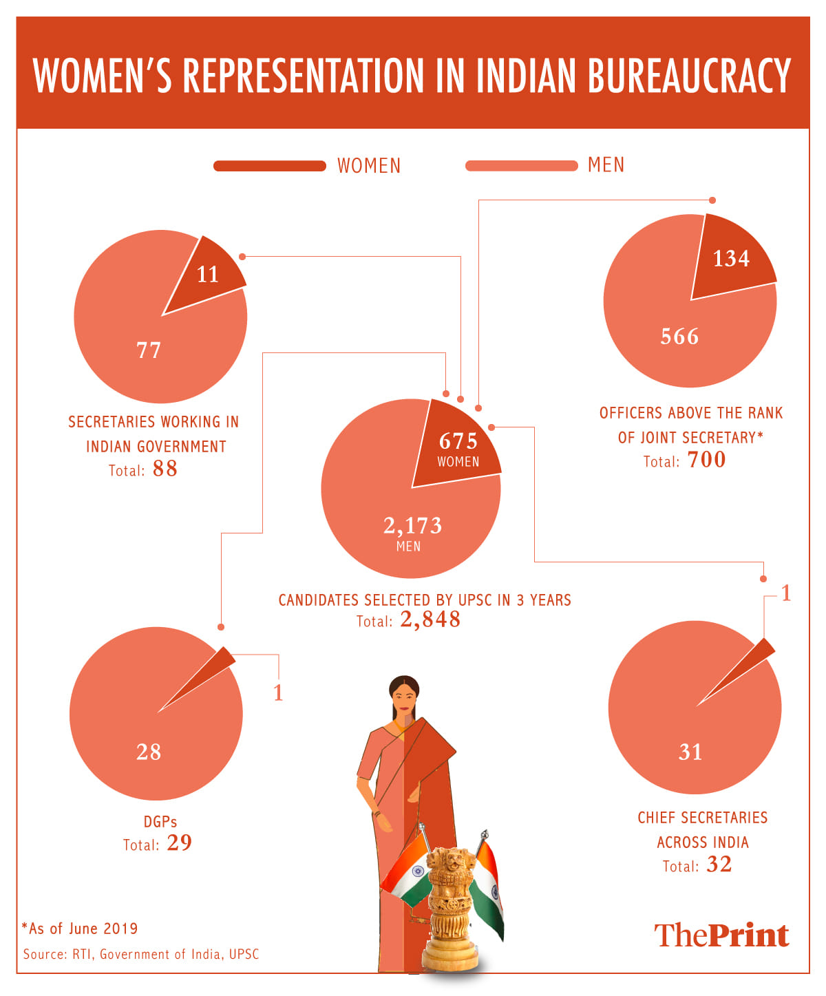 जून 2019 के सरकारी आंकड़ों के अनुसार, केंद्र सरकार में संयुक्त सचिव स्तर और उससे ऊंचे स्तर वाले 700 अधिकारियों में से केवल 134 महिलाएं थीं. जो कि 19.14 प्रतिशत हैं.