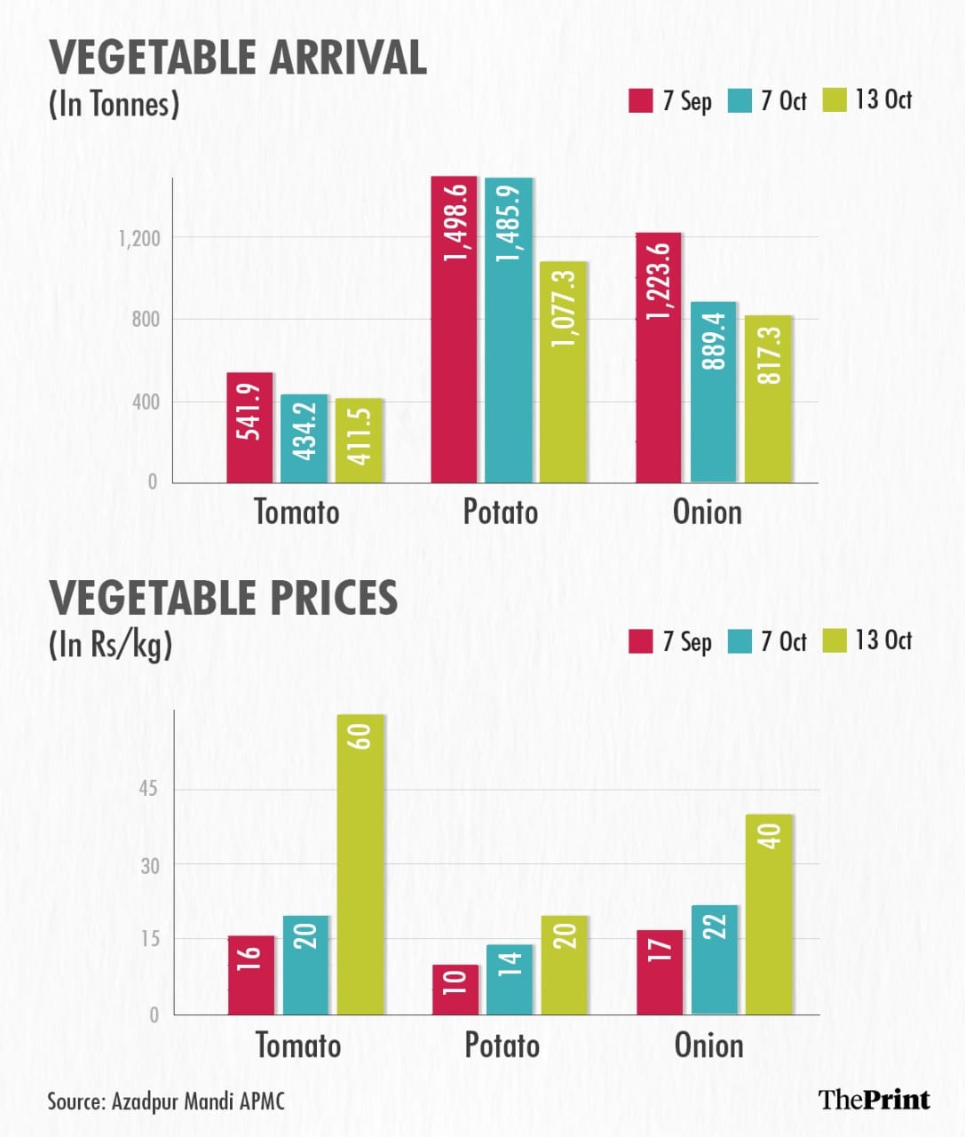 चौहान बताते हैं, ‘इसके अलावा, कर्नाटक, मध्य प्रदेश और महाराष्ट्र जैसे राज्यों, जो प्याज और टमाटर के प्रमुख उत्पादक और आपूर्तिकर्ता हैं, में भी सितंबर में हुई भारी बारिश की वजह से इनकी फसल को नुकसान हुआ है.’