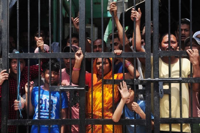 हाथ में पानी के केन लिए खड़ी रुखसाना अपने बच्चों को संभालती हुई बताती हैं, ‘घर में पानी नहीं है. पानी भरने के लिए भी नहीं जाने दे रहे हैं. हमने क्या गुनाह किया है जो हमें हमारे ही घरों में बंद कर दिया है.’