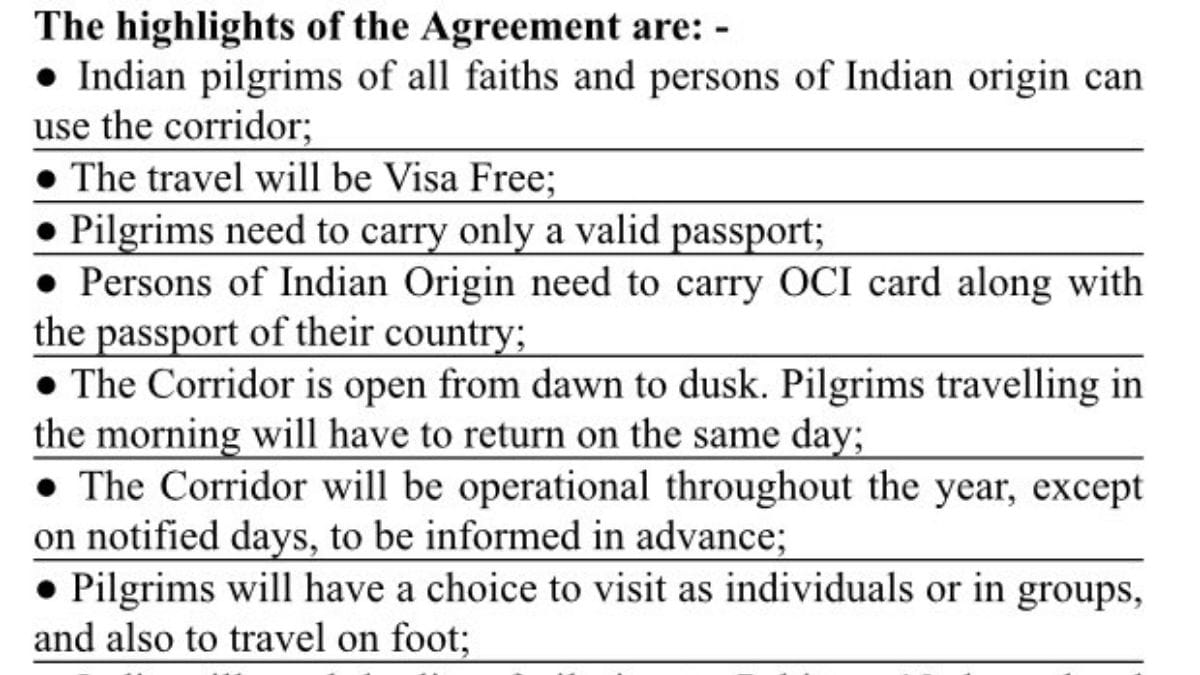 तीर्थयात्रियों को अपने पास वैध पासपोर्ट रखना होगा. बिना वीजा के यात्रा की सकती है किसकी भी धर्म का व्यक्ति जा सकता है परमिट सिर्फ करतारपुर की यात्रा के लिए जारी किया जाएगा.