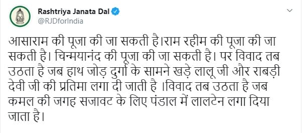 पार्टी के अकाउंट से जारी एक ट्वीट में साफ कहा गया है कि ‘आशाराम की पूजा की जा सकती है. राम रहीम की पूजा की जा सकती है. चिन्मयानंद की पूजा की जा सकती है. पर विवाद तब उठता है जब हाथ जोड़ कर दुर्गा के सामने खड़े लालू जी और राबड़ी देवी की प्रतिमा लगा दी जाती है. विवाद तब उठता है जब कमल की जगह सजावट के लिए पंडाल में लालेटन लगा दिया जाता है.’