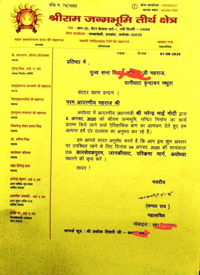 ट्रस्ट की ओर से पीले रंग का इनवाइट लेटर सबको ई-मेल किया गया है. इस इनवाइट में लिखा है- ‘प्रधानमंत्री नरेंद्र मोदी द्वारा मंदिर निर्माण का कार्य शुरू किए जाने वाले ऐतिहासिक क्षण का आमंत्रण देते हुए हम उल्लास महसूस कर रहे हैं.’