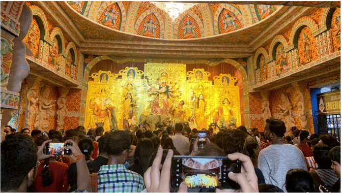 महामारी के दो साल छोटे स्तर पर उत्सव के बाद इस साल कोलकाता में पूजा का अयोजन बिना किसी पाबंदी के अपने पूरे रौ में हो रहा है. लोग प्रतिमा और पंडाल की कला करीब से देखने के लिए कतार लगाए रहते हैं, दिप्रिंट आपके लिए कोलकाता और उसके आसपास के अनोखे पंडालों की एक झलक ले आया है.