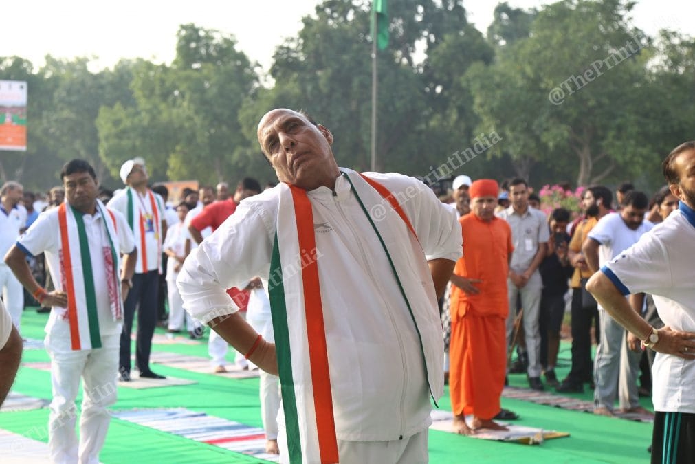 इस मौके पर रक्षामंत्री राजनाथ सिंह ने दिल्ली के राजपथ पर योग किया.