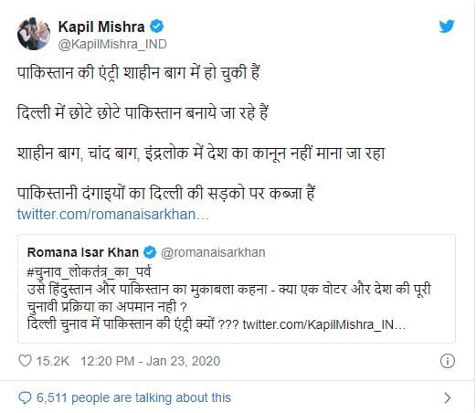 शाहीन बाग़ के जरिए चुनाव को सांप्रदायिक बनाने के खेल के बीच कपिल मिश्रा ने एक और विवादित ट्वीट किया, ‘पाकिस्तान की एंट्री शाहीन बाग में हो चुकी हैं. दिल्ली में छोटे-छोटे पाकिस्तान बनाये जा रहे हैं. शाहीन बाग, चांद बाग, इंद्रलोक में देश का कानून नहीं माना जा रहा. पाकिस्तानी दंगाइयों का दिल्ली की सड़कों पर कब्जा है.’