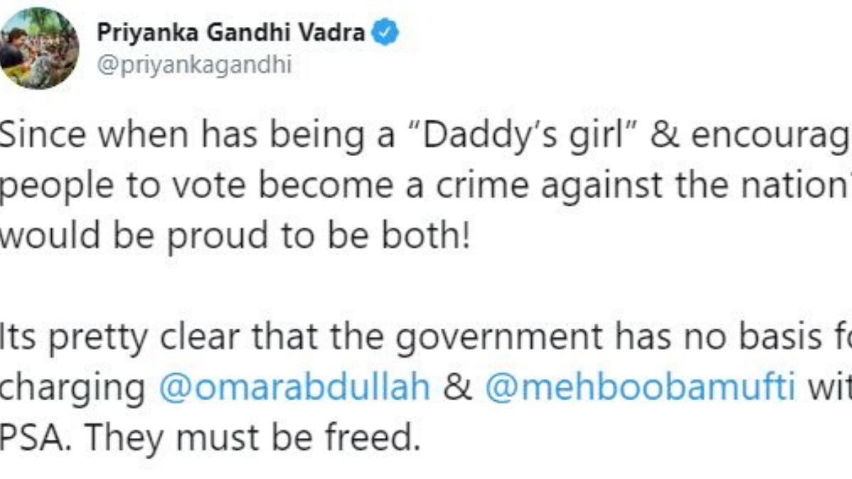 प्रियंका ने ट्वीट कर कहा, ‘यह बहुत स्पष्ट है कि उमर अब्दुल्ला और महबूबा मुफ्ती को पीएसए के तहत आरोपी बनाने का कोई आधार नहीं है. उन्हें रिहा किया जाना चाहिए.’