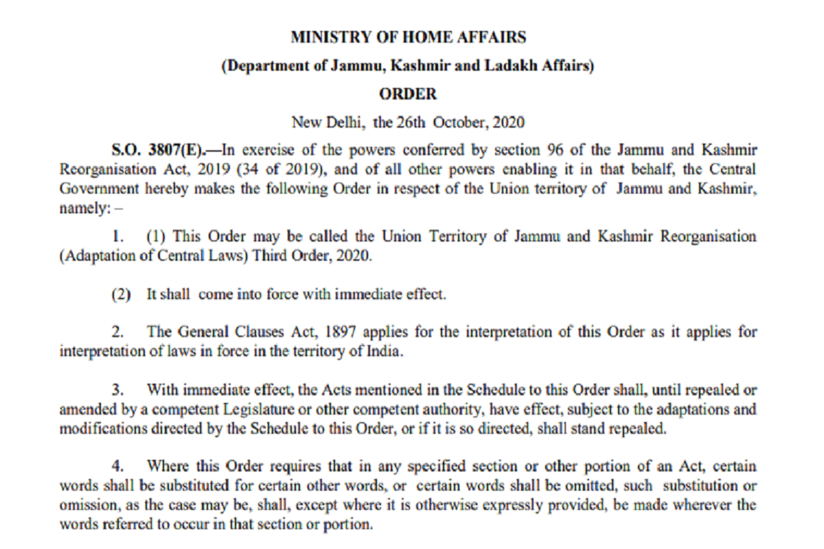 गृह मत्रालय ने जम्मू-कश्मीर पुनर्गठन अधिनियम 2019 को लेकर आदेश जारी किया है. इसमें सबसे अहम है कि प्रदेश में जमीन खरीदने के लिए अब निवास प्रमाण पत्र की जरूरत नहीं पड़ेगी. लेकिन खेती की जमीन अब नहीं खरीदा जा सकेगा.
