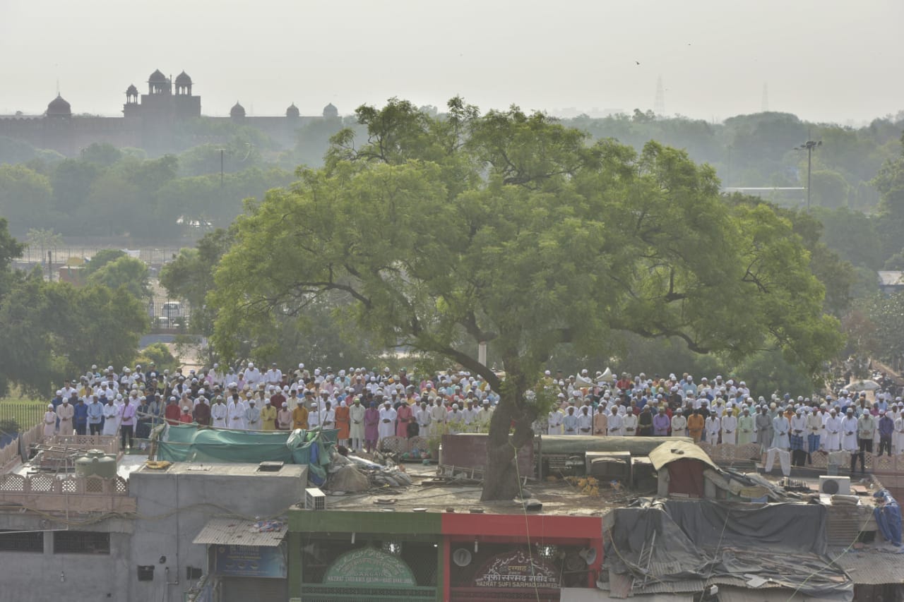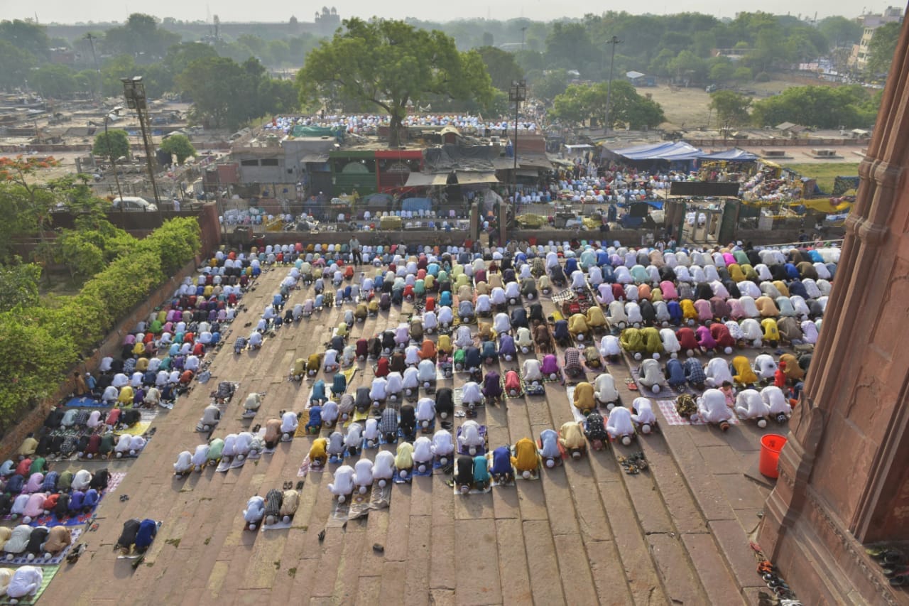 रोजा खत्म होने के बाद ईद पर जामा मस्जिद परिसर में नमाज अदा करते नमाजी.