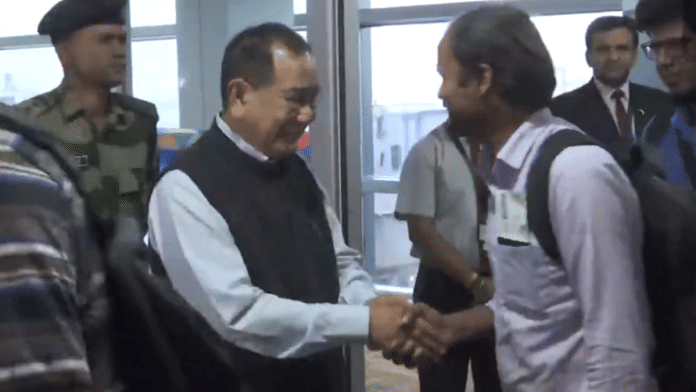 निकाले गए भारतीय नागरिकों का हवाई अड्डे पर केंद्रीय विदेश राज्य मंत्री (MoS) राजकुमार रंजन सिंह ने हाथ मिलाकर और हाथ जोड़कर भारतीय नागरिकों का स्वागत किया.