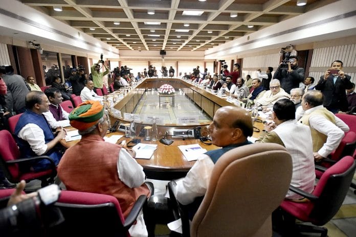 नई दिल्ली: संसद परिसर में मंगलवार को रक्षामंत्री और डिप्यूटी नेता राजनाथ सिंह सभी पार्टियों की बैठक की अध्यक्षता की. सरकार की ओर से संसदीय मामलों के मंत्री प्रह्लाद जोशी, संसदीय मामलों के एमओएस मुरलीधरन और अर्जुन राम मेघवाल समेत सदन के नेता पीयूष गोयल बैठक में शामिल हुए.