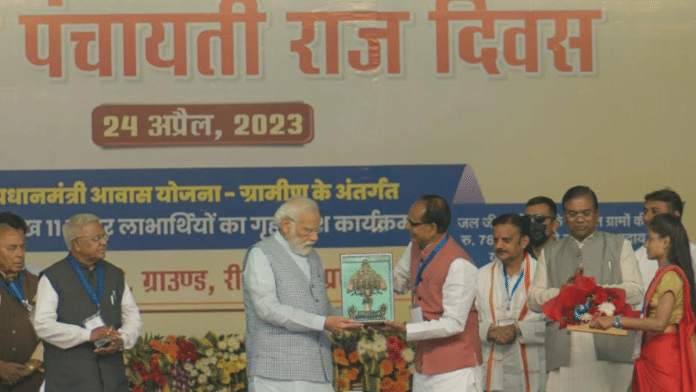 प्रधानमंत्री श्री नरेन्द्र मोदी राष्ट्रीय पंचायती राज दिवस पर देशभर की पंचायती राज संस्थाओं के निर्वाचित प्रतिनिधियों और पदाधिकारियों के साथ-साथ विशेष ग्राम सभाओं को संबोधित कर रहे थे. राज्यपाल श्री मंगू भाई पटेल, मुख्यमंत्री श्री शिवराज सिंह चौहान, केंद्रीय ग्रामीण विकास एवं पंचायती राज मंत्री श्री गिरिराज सिंह की उपस्थिति में रीवा के विशेष सशस्त्र बल मैदान में राष्ट्रीय पंचायती राज दिवस समारोह से प्रधानमंत्री श्री मोदी ने प्रधानमंत्री आवास योजना के 4 लाख 11 हजार हितग्राहियों को वर्चुअल गृह प्रवेश कराया. साथ ही मध्यप्रदेश में जल जीवन मिशन की 7853 करोड़ रूपये की लागत की  रीवा, सतना और सीधी जिलों के लिए स्वीकृत 5 बड़ी समूह जल-प्रदाय योजनाओं का शिलान्यास भी किया. प्रधानमंत्री श्री मोदी ने मध्यप्रदेश के रेल नेटवर्क के शत-प्रतिशत विद्युतीकरण को राष्ट्र को समर्पित कर 2300 करोड़ रूपये से अधिक की रेल परियोजनाओं का लोकार्पण, शिलान्यास एवं शुभांरभ किया.