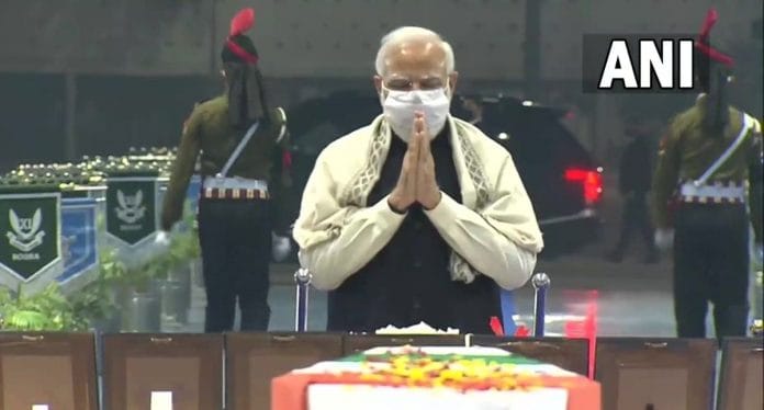 नई दिल्लीः तमिलनाडु के कुन्नूर में हुए हेलीकॉप्टर क्रैश में जान गंवाने वाले सीडीएस जनरल बिपिन रावत व उनकी पत्नी मधुलिका रावत सहित अन्य 11 लोगों के पार्थिव शरीर को पीएम मोदी ने श्रद्धांजलि दी. इसके अलावा रक्षामंत्री राजनाथ सिंह, राष्ट्रीय सुरक्षा सलाहकार अजित डोभाल सहित सेनाओं के चीफ ने भी श्रद्धांजलि दी. पीएम मोदी ने हादसे का शिकार हुए जवानों के परिवार वालों से भी मुलाकात की.