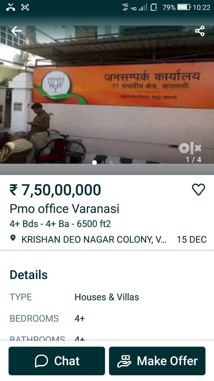 बता दें कि ओएलएक्स के पोर्टल पर साढ़े सात करोड़ रुपए में भेलूपुर के गुरुबाग स्थित जवाहर नगर कार्यालय की अलग-अलग एंगल से चार तस्वीरें विक्रेता द्वारा अपलोड की गयी थी. इस पोस्ट में कार्यालय का पता कृष्ण देव नगर बताया गया था. जबकि संसदीय कार्यालय वाराणसी के गुरुधाम कॉलोनी में है. विज्ञापन में संसदीय कार्यालय की तस्वीरें भी पोस्ट की गई थी.
