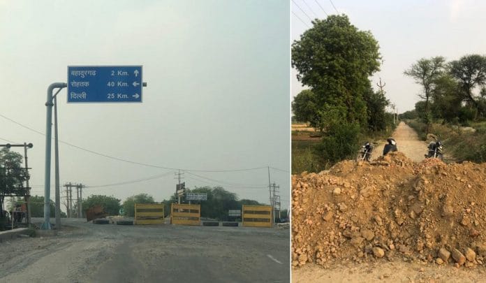दिप्रिंट ने इन गांवों का दौरा किया तो पाया कि पक्की सड़कों के साथ-साथ कच्ची सड़कों पर भी जगह-जगह खाई बना दी हैं. कैर गांव हरियाणा और दिल्ली को जोड़ता है. इस गांव के आसपास चार-पांच जगहों पर जेसीबी से खाई बना दी गई है. रोज दिल्ली किसी न किसी काम से आने वाले लोगों ने खाली हो चुके खेतों को रास्ता बनाना शुरू कर दिया.