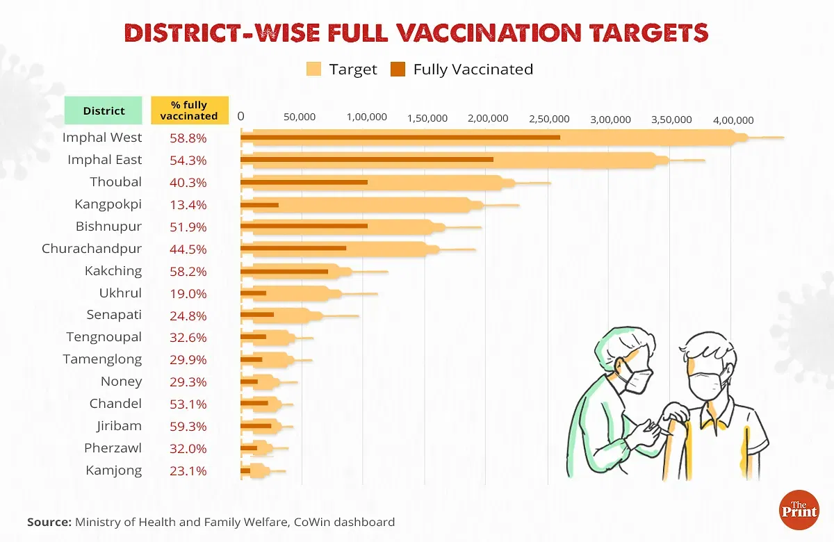 दिप्रिंट द्वारा प्राप्त स्वास्थ्य मंत्रालय के आंकड़ों के अनुसार, जबकि कांगपोकपी में जनसंख्या लक्ष्य 2,26,948 है, सेनापति में लक्ष्य केवल 97,654 है.