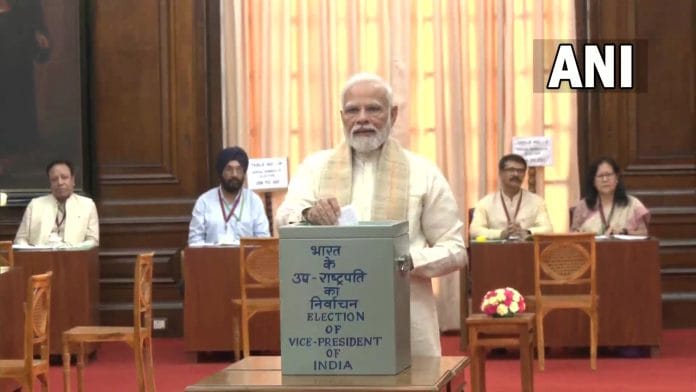 नई दिल्ली: देश के नए उपराष्ट्रपति के चुनाव के लिए संसद भवन में शनिवार को वोटिंग शुरू हो गई है. प्रधानमंत्री नरेंद्र मोदी ने अपना वोट डाल दिया है.