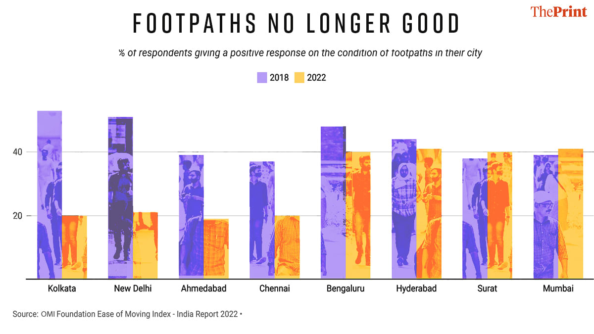 2018 में, कोलकाता (53 प्रतिशत) के बाद दूसरे स्थान पर दिल्ली में 51 प्रतिशत उत्तरदाताओं ने शहर में फुटपाथों की स्थिति पर सकारात्मक प्रतिक्रिया दी थी. 2022 में, यह आंकड़ा दिल्ली में 21 प्रतिशत और कोलकाता में 20 प्रतिशत था.