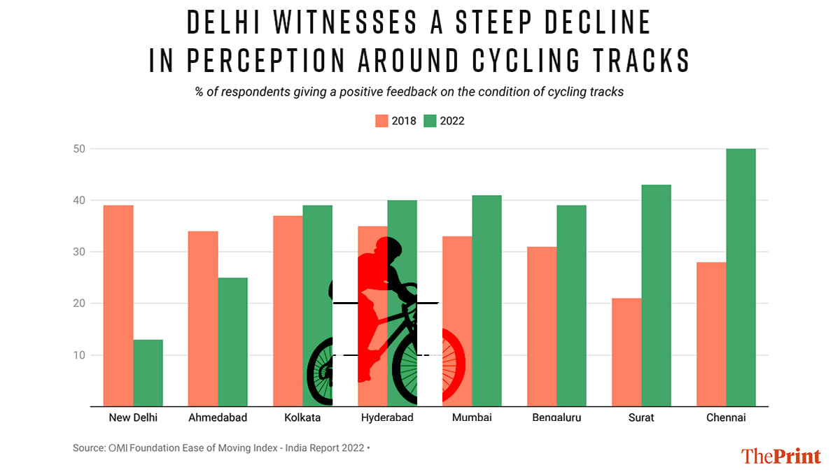 दिल्ली में साइकिलिंग को लेकर सकारात्मक धारणा 2018 में सबसे अधिक थी- लगभग 39 प्रतिशत लोगों ने शहर में साइकिल ट्रैक के लिए सकारात्मक प्रतिक्रिया दी थी. लेकिन 2022 में, केवल 13 प्रतिशत लोग – मेगासिटी में सबसे कम – इसके बारे में सकारात्मक थे.