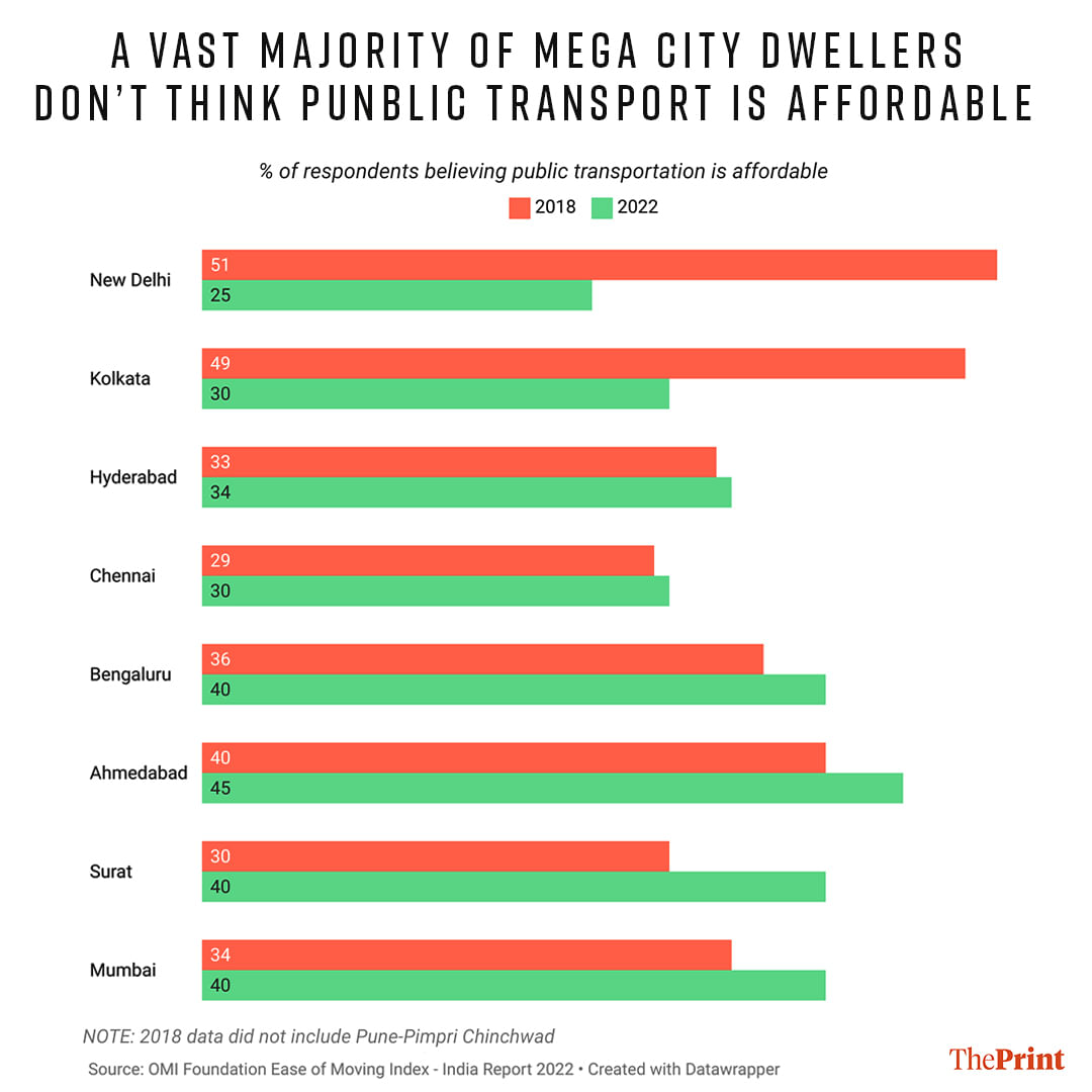 2018 में, आधी दिल्ली (या दो में से एक व्यक्ति) का मानना था कि सार्वजनिक परिवहन सस्ता था, लेकिन 2022 में लगभग चार में से एक व्यक्ति का ऐसा मानना था.